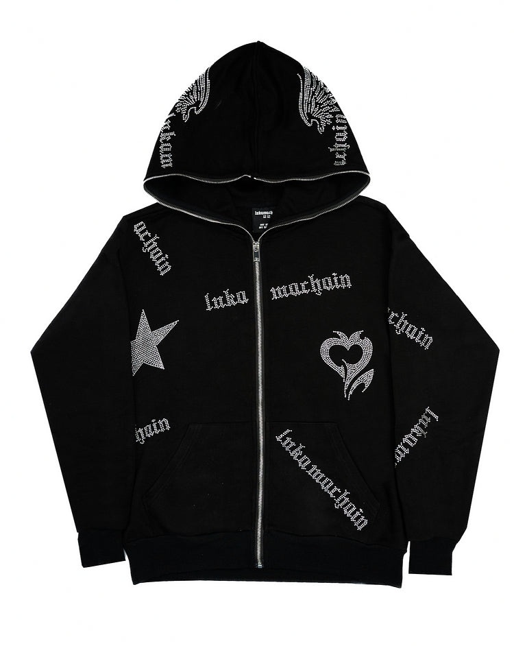 Este é um casaco com capuz de zíper na cor preta, feito de moletom. Ele possui um design chamativo com aplicações de strass ou pedras brilhantes, que formam diversas estampas. No peito, há a palavra "luko machain" e um desenho de um coração com detalhes tribais. Na manga, a mesma palavra "lukomachain" aparece novamente. Há também outros desenhos em strass espalhados pela peça.